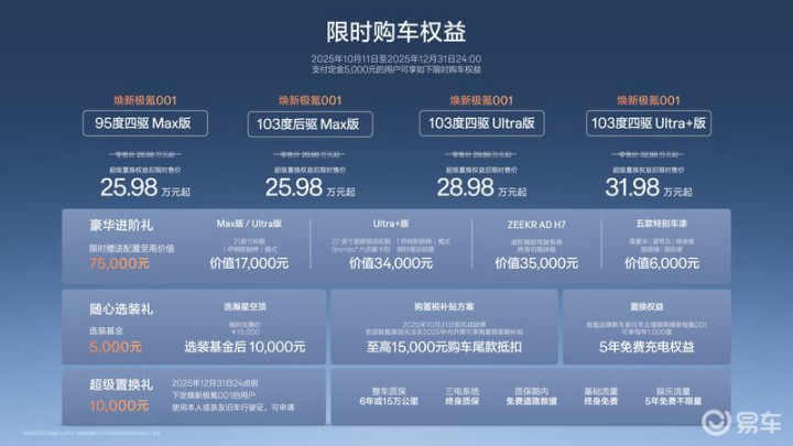 易车讯10月11日,极氪汽车官方宣布,焕新极氪001正式上市,售价26.98-32.98万元,限时置换价25.98-31.98万元。新车以“星空音乐厅”为座舱概念,融合顶尖音响、星空天幕、深度按摩与舒适躺椅等四大配置,内饰材质和智能交互全面升级。
